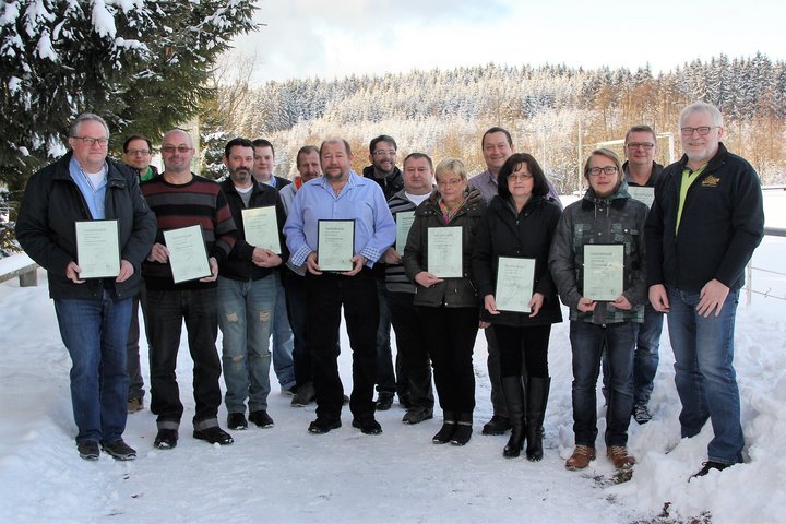 Das Bild zeigt von links die geehrten Clemens Wicklein, den scheidenden zweiten Vorsitzenden Oliver See, Hans-Peter Knorr, Jürgen Martin, Vorsitzenden Dominic Fischer, Dieter Krebs, Bernd Ketterer, Edgar Martin, Reiner Krebs, Isolde Reißig, Roland See, Christine Förtsch, Dominik Fehn, Matthias Beetz und Kassier Manfred Reißig.