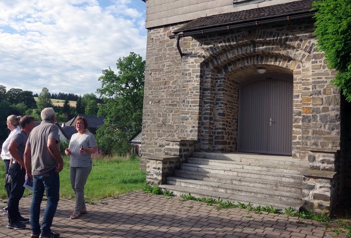 Ein Bild verschaffte sich das Gremium auch von der im städtischen Grundbesitz befindlichen Filialkirche neben dem Friedhof an einem Hang oberhalb der Ortschaft. Eine sicherheitstechnische Prüfung offenbarte einige Mängel, größtenteils jedoch im überschaubaren Arbeits- und Kostenrahmen. „Handlungsbedarf besteht. Wir müssen das instand setzen“, konstatierte der Bürgermeister. Als dringlichste Maßnahmen werden zunächst die Handläufe beim Treppenaufgang hoch zur Empore sowie im äußeren Bereich angegangen. Bei der Treppe zur Empore ist der Handlauf im unteren Bereich zu niedrig angebracht und muss lediglich etwas nach oben versetzt werden. Im oberen Bereich der Treppe ist bis jetzt noch kein Handlauf vorhanden, was nachgeholt wird. Gleiches gilt auch für den Außenbereich. Hier werden - ebenfalls aus Sicherheitsgründen - rechts und links der Eingangstreppe Handläufe angebracht. Bemängelt wurde beispielsweise auch das Fehlen eines Feuerlöschers und Erste-Hilfe-Kastens sowie einer Beleuchtung im oberen Bereich. Sicherheitstechnische Probleme ergeben sich auch im Bereich des Glockenturms. 80 Prozent der erforderlichen Maßnahmen können vom Bauhof selbst erledigt werden. Ein wohl größeres Problem stellt ein deutlich sichtbarer großer Feuchtigkeitsfleck unterhalb des linken Fensters im Altarbereich auf, worauf Susanne Daum (MiM) aufmerksam machte.