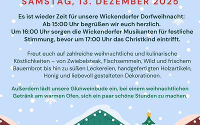 Am Samstag, 13. Dezember laden die Wickendorfer Vereine und Privatpersonen zur Wickendorfer Dorfweihnacht ein. Beginn ist ist um 15:00 Uhr.
