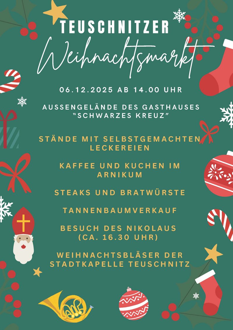 Am Samstag, den 06.12.2025, findet der diesjährige Teuschnitzer Weihnachtsmarkt statt. Ab 14 Uhr gibt es – und das ist NEU! – im Außengelände des Gasthauses „Schwarzes Kreuz“ festliches Flair, allerhand Leckeres und Schönes, Unterhaltung und Musik.